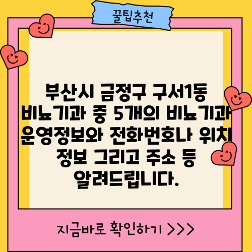 이 블로그 글에서는 부산 금정구에 위치한 5개 병원 및 의원의 정보를 제공합니다. 각 병원 및 의원에 대한 정보는 다음과 같습니다.