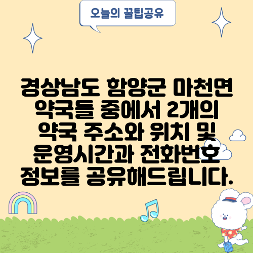경상남도 함양군 마천면 약국들 중에서 2개의 약국 주소와 위치 및 운영시간과 전화번호 정보를 공유해드립니다.