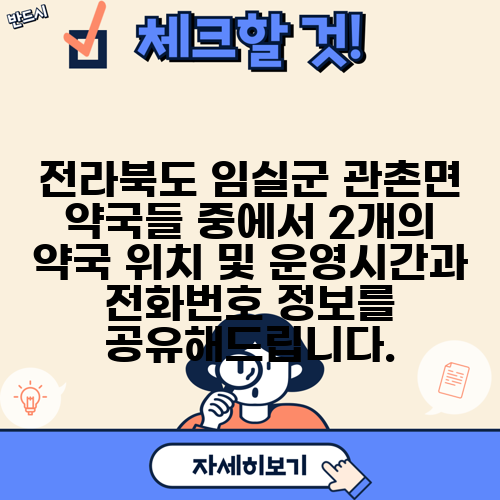전라북도 임실군 관촌면 약국들 중에서 2개의 약국 위치 및 운영시간과 전화번호 정보를 공유해드립니다.