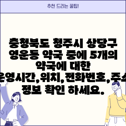 충청북도 청주시 상당구 영운동 약국 중에 5개의 약국에 대한 운영시간,위치,전화번호,주소 정보 확인 하세요.