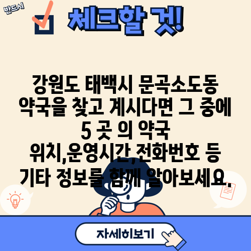 강원도 태백시 문곡소도동 약국을 찾고 계시다면 그 중에 5 곳 의 약국 위치,운영시간,전화번호 등 기타 정보를 함께 알아보세요.