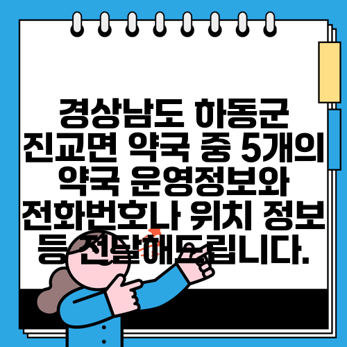 경상남도 하동군 진교면 약국 중 5개의 약국 운영정보와 전화번호나 위치 정보 등 전달해드립니다.