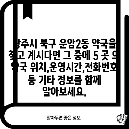 광주시 북구 운암2동 약국을 찾고 계시다면 그 중에 5 곳 의 약국 위치,운영시간,전화번호 등 기타 정보를 함께 알아보세요.