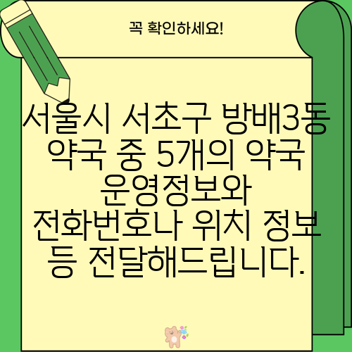 서울시 서초구 방배3동 약국 중 5개의 약국 운영정보와 전화번호나 위치 정보 등 전달해드립니다.