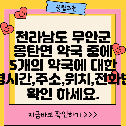 전라남도 무안군 몽탄면 약국 중에 5개의 약국에 대한 운영시간,주소,위치,전화번호 확인 하세요.