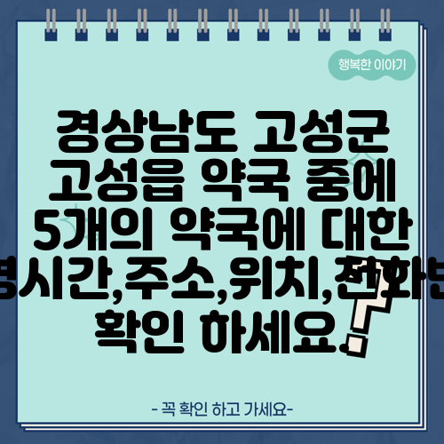 경상남도 고성군 고성읍 약국 중에 5개의 약국에 대한 운영시간,주소,위치,전화번호 확인 하세요.
