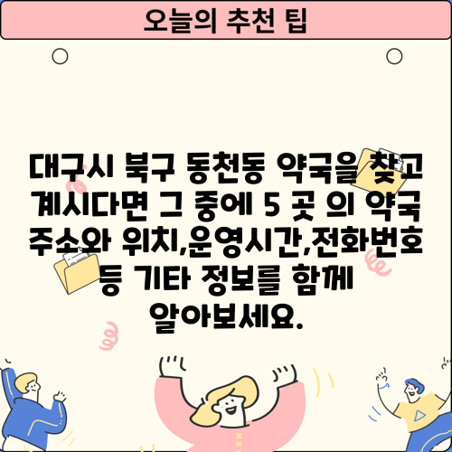 대구시 북구 동천동 약국을 찾고 계시다면 그 중에 5 곳 의 약국 주소와 위치,운영시간,전화번호 등 기타 정보를 함께 알아보세요.