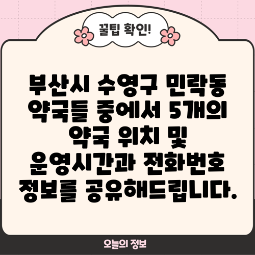 부산시 수영구 민락동 약국들 중에서 5개의 약국 위치 및 운영시간과 전화번호 정보를 공유해드립니다.