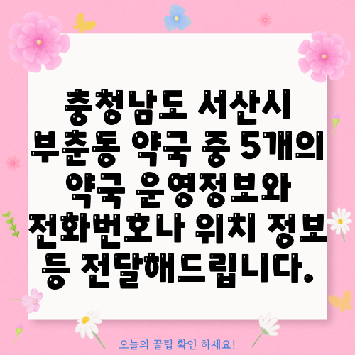 충청남도 서산시 부춘동 약국 중 5개의 약국 운영정보와 전화번호나 위치 정보 등 전달해드립니다.