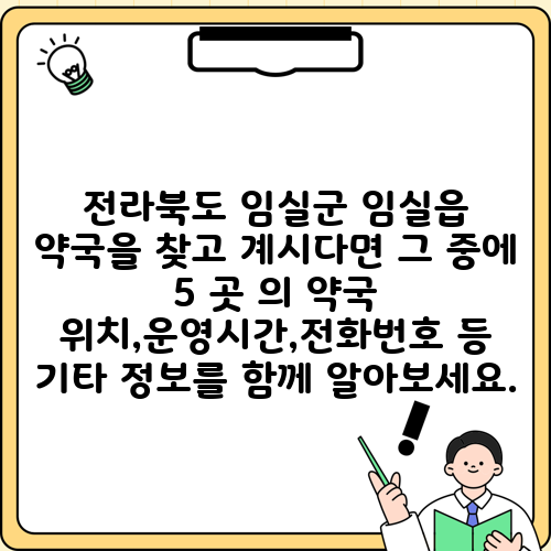 전라북도 임실군 임실읍 약국을 찾고 계시다면 그 중에 5 곳 의 약국 위치,운영시간,전화번호 등 기타 정보를 함께 알아보세요.