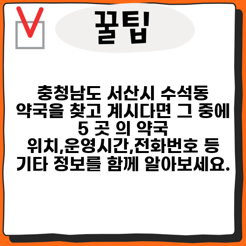 충청남도 서산시 수석동 약국을 찾고 계시다면 그 중에 5 곳 의 약국 위치,운영시간,전화번호 등 기타 정보를 함께 알아보세요.