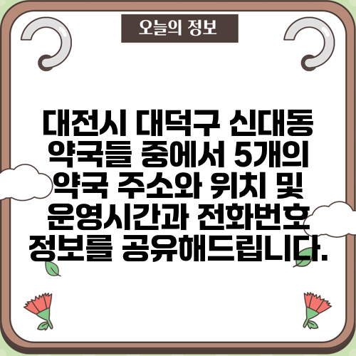 대전시 대덕구 신대동 약국들 중에서 5개의 약국 주소와 위치 및 운영시간과 전화번호 정보를 공유해드립니다.