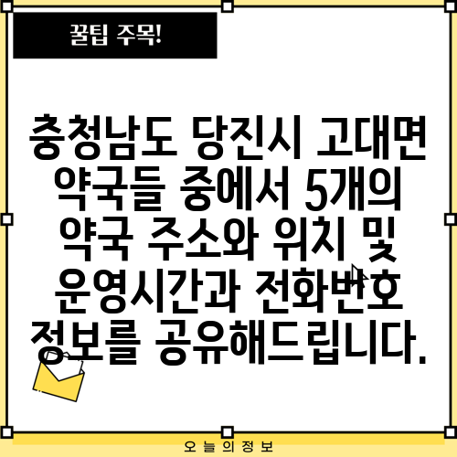 충청남도 당진시 고대면 약국들 중에서 5개의 약국 주소와 위치 및 운영시간과 전화번호 정보를 공유해드립니다.