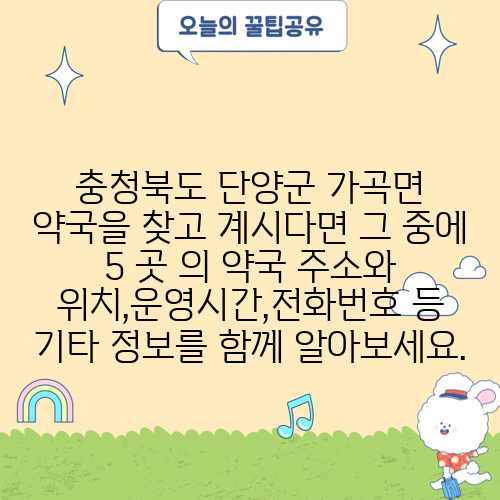 충청북도 단양군 가곡면 약국을 찾고 계시다면 그 중에 5 곳 의 약국 주소와 위치,운영시간,전화번호 등 기타 정보를 함께 알아보세요.