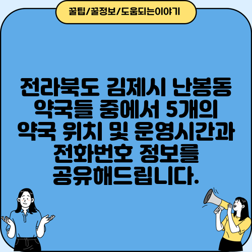 전라북도 김제시 난봉동 약국들 중에서 5개의 약국 위치 및 운영시간과 전화번호 정보를 공유해드립니다.