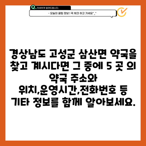 경상남도 고성군 삼산면 약국을 찾고 계시다면 그 중에 5 곳 의 약국 주소와 위치,운영시간,전화번호 등 기타 정보를 함께 알아보세요.