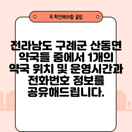 전라남도 구례군 산동면 약국들 중에서 1개의 약국 위치 및 운영시간과 전화번호 정보를 공유해드립니다.