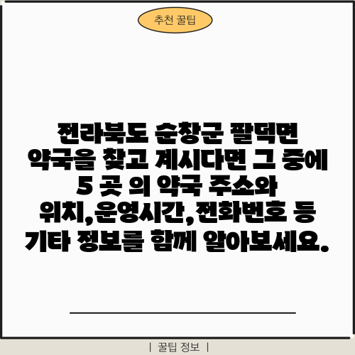 전라북도 순창군 팔덕면 약국을 찾고 계시다면 그 중에 5 곳 의 약국 주소와 위치,운영시간,전화번호 등 기타 정보를 함께 알아보세요.