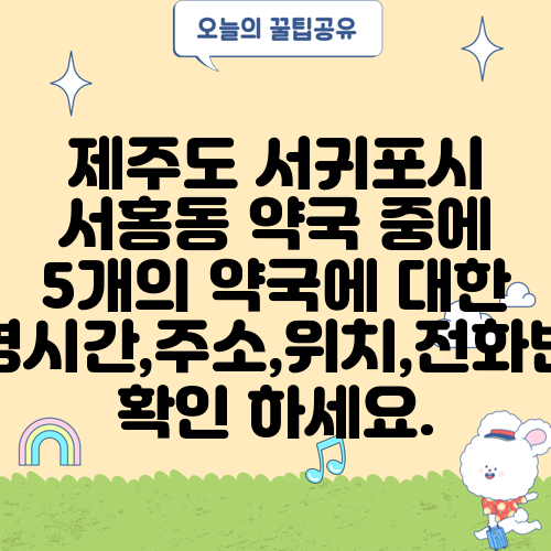 제주도 서귀포시 서홍동 약국 중에 5개의 약국에 대한 운영시간,주소,위치,전화번호 확인 하세요.