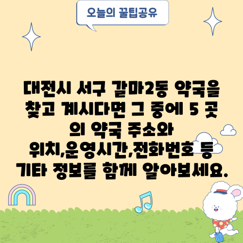 1. 갈마약국 정보 1. 갈마약국 운영시간 및 위치, 전화번호 확인하세요! 주소: 대전 서구 계룡로 353 261-14 운영 시간: 08:30에 영업 ...