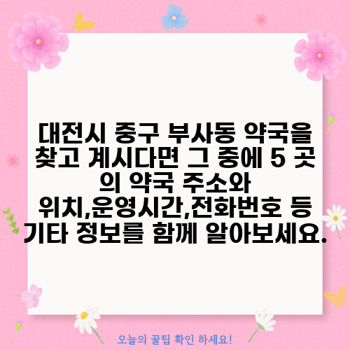 대전시 중구 부사동 약국을 찾고 계시다면 그 중에 5 곳 의 약국 주소와 위치,운영시간,전화번호 등 기타 정보를 함께 알아보세요.
