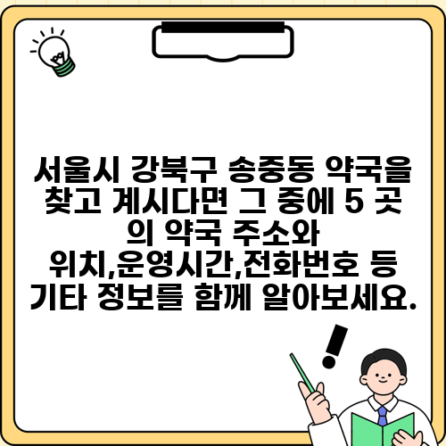서울시 강북구 송중동 약국을 찾고 계시다면 그 중에 5 곳 의 약국 주소와 위치,운영시간,전화번호 등 기타 정보를 함께 알아보세요.