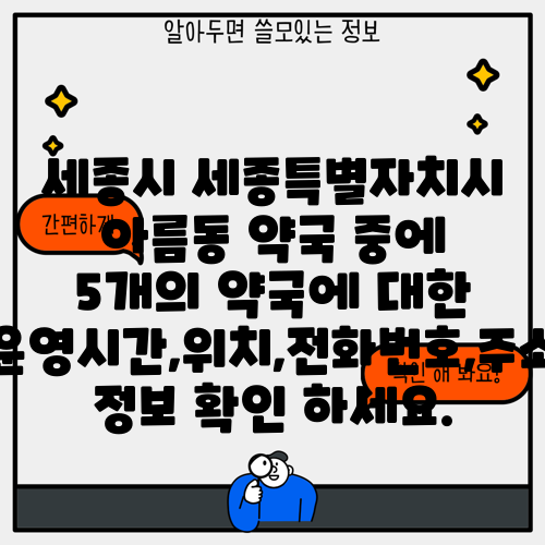 세종시 세종특별자치시 아름동 약국 중에 5개의 약국에 대한 운영시간,위치,전화번호,주소 정보 확인 하세요.