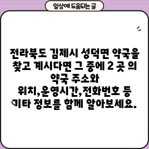 전라북도 김제시 성덕면 약국을 찾고 계시다면 그 중에 2 곳 의 약국 주소와 위치,운영시간,전화번호 등 기타 정보를 함께 알아보세요.