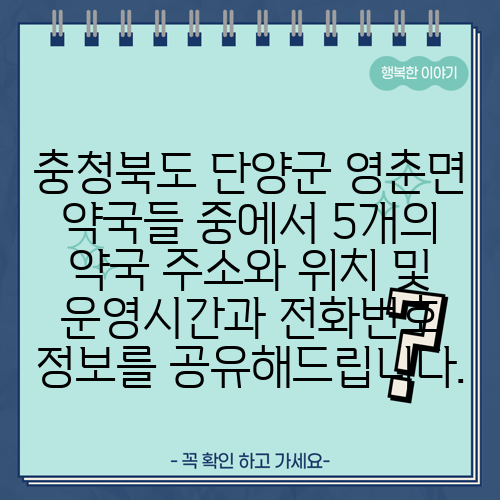 충청북도 단양군 영춘면 약국들 중에서 5개의 약국 주소와 위치 및 운영시간과 전화번호 정보를 공유해드립니다.