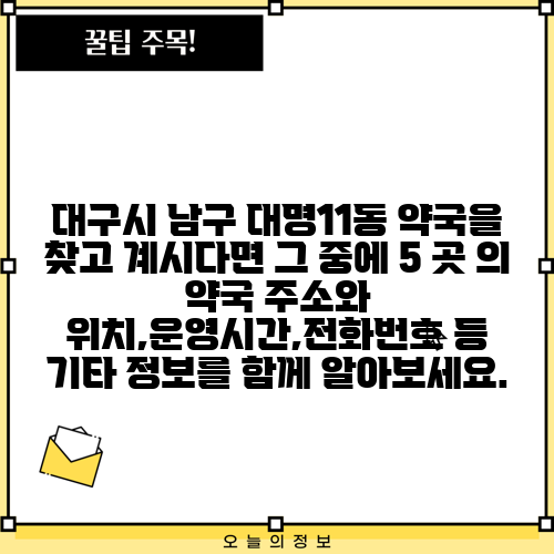 대구시 남구 대명11동 약국을 찾고 계시다면 그 중에 5 곳 의 약국 주소와 위치,운영시간,전화번호 등 기타 정보를 함께 알아보세요.