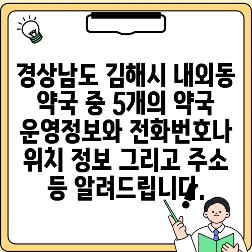 경상남도 김해시 내외동 약국 중 5개의 약국 운영정보와 전화번호나 위치 정보 그리고 주소 등 알려드립니다.