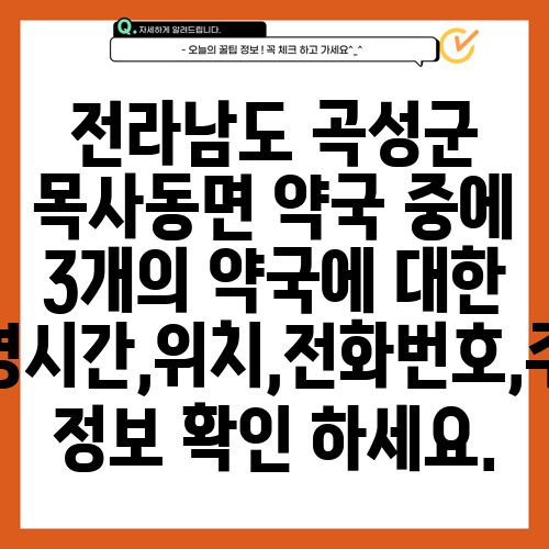 전라남도 곡성군 목사동면 약국 중에 3개의 약국에 대한 운영시간,위치,전화번호,주소 정보 확인 하세요.