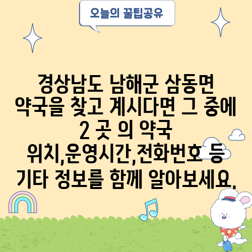 경상남도 남해군 삼동면 약국을 찾고 계시다면 그 중에 2 곳 의 약국 위치,운영시간,전화번호 등 기타 정보를 함께 알아보세요.