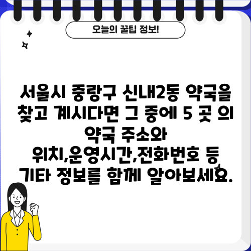 서울시 중랑구 신내2동 약국을 찾고 계시다면 그 중에 5 곳 의 약국 주소와 위치,운영시간,전화번호 등 기타 정보를 함께 알아보세요.