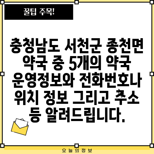 충청남도 서천군 종천면 약국 중 5개의 약국 운영정보와 전화번호나 위치 정보 그리고 주소 등 알려드립니다.