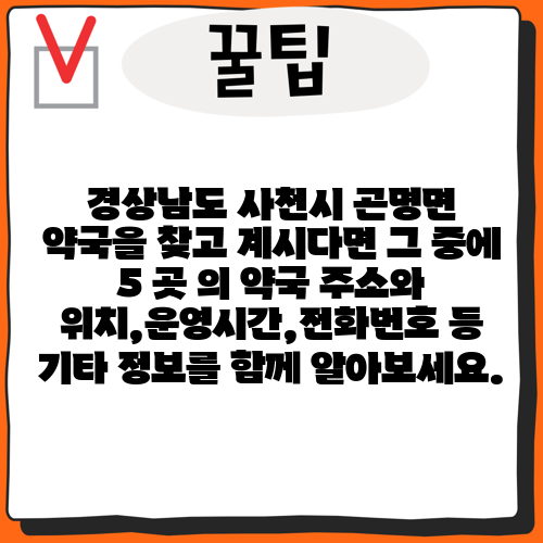 경상남도 사천시 곤명면 약국을 찾고 계시다면 그 중에 5 곳 의 약국 주소와 위치,운영시간,전화번호 등 기타 정보를 함께 알아보세요.