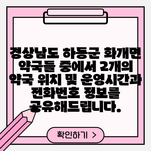 경상남도 하동군 화개면 약국들 중에서 2개의 약국 위치 및 운영시간과 전화번호 정보를 공유해드립니다.