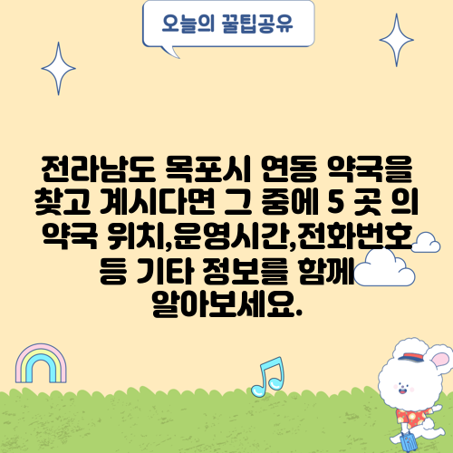 전라남도 목포시 연동 약국을 찾고 계시다면 그 중에 5 곳 의 약국 위치,운영시간,전화번호 등 기타 정보를 함께 알아보세요.