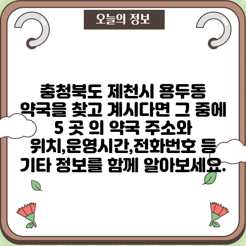 충청북도 제천시 용두동 약국을 찾고 계시다면 그 중에 5 곳 의 약국 주소와 위치,운영시간,전화번호 등 기타 정보를 함께 알아보세요.