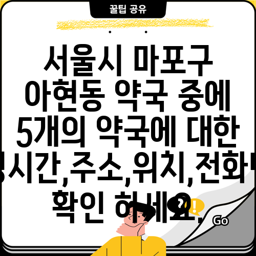 서울시 마포구 아현동 약국 중에 5개의 약국에 대한 운영시간,주소,위치,전화번호 확인 하세요.