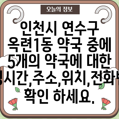 인천시 연수구 옥련1동 약국 중에 5개의 약국에 대한 운영시간,주소,위치,전화번호 확인 하세요.