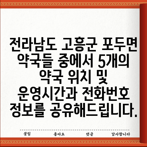 전라남도 고흥군 포두면 약국들 중에서 5개의 약국 위치 및 운영시간과 전화번호 정보를 공유해드립니다.