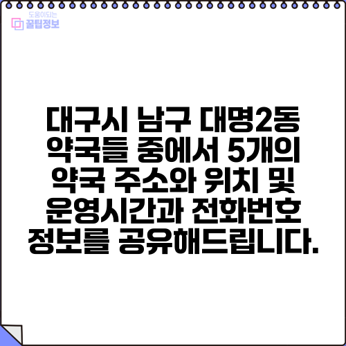 대구시 남구 대명2동 약국들 중에서 5개의 약국 주소와 위치 및 운영시간과 전화번호 정보를 공유해드립니다.