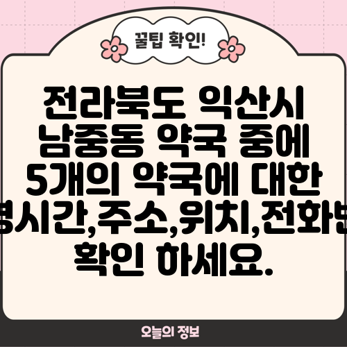 전라북도 익산시 남중동 약국 중에 5개의 약국에 대한 운영시간,주소,위치,전화번호 확인 하세요.