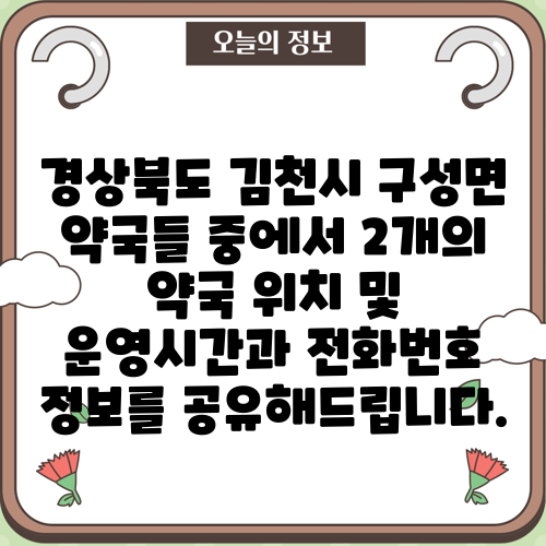 경상북도 김천시 구성면 약국들 중에서 2개의 약국 위치 및 운영시간과 전화번호 정보를 공유해드립니다.
