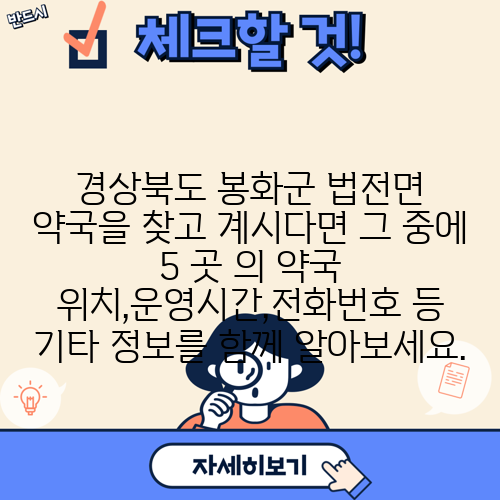 경상북도 봉화군 법전면 약국을 찾고 계시다면 그 중에 5 곳 의 약국 위치,운영시간,전화번호 등 기타 정보를 함께 알아보세요.