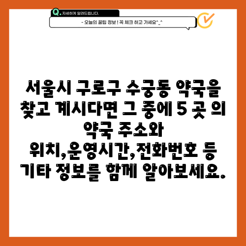 서울시 구로구 수궁동 약국을 찾고 계시다면 그 중에 5 곳 의 약국 주소와 위치,운영시간,전화번호 등 기타 정보를 함께 알아보세요.