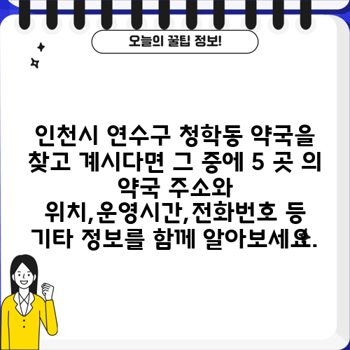 인천시 연수구 청학동 약국을 찾고 계시다면 그 중에 5 곳 의 약국 주소와 위치,운영시간,전화번호 등 기타 정보를 함께 알아보세요.