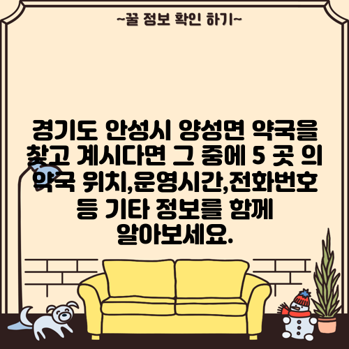 경기도 안성시 양성면 약국을 찾고 계시다면 그 중에 5 곳 의 약국 위치,운영시간,전화번호 등 기타 정보를 함께 알아보세요.