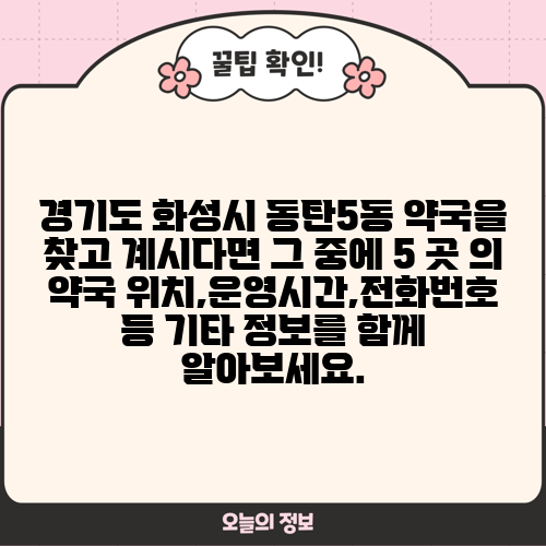 경기도 화성시 동탄5동 약국을 찾고 계시다면 그 중에 5 곳 의 약국 위치,운영시간,전화번호 등 기타 정보를 함께 알아보세요.
